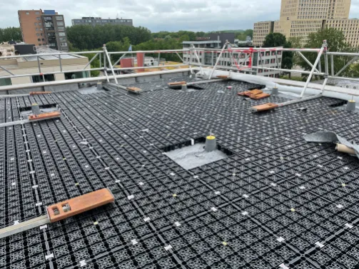 The hollow Permavoid subbase makes it possible to store more rainwater in lightweight geocellular units underneath the soil in podium decks, blue-green roof systems and roof gardens. This stored rainwater is made available to the plants by capillary rise through capillary fibre columns in the Permavoid units. This nature- based solution of capillary irrigation eliminates the need for drip lines, valves, hoses, pumps and the associated maintenance requirements. Water is available for the plants when they need it, naturally, on-demand, and most importantly without the use of energy; just like in nature. Water is the key to successful green infrastructure at any level, in every green design. Keep rainwater out of the sewer and put it to work to support, biodiversity and help cool the urban environment.